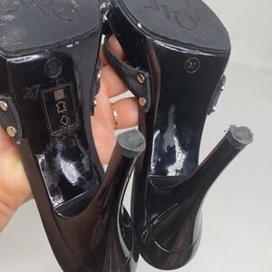 This is a beautiful pair of Dior Sz 37 Black Logo High Heel Sandals with Logo’d Bow Studs. Black lucite base and heel with silver tone studs and accents. Leather interior logo inner and outer sole. Non slip outer sole. 4” heel. Normal wear. Some scuffs and scratches but overall in very good condition. Made in Italy.