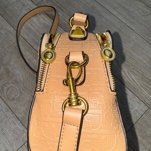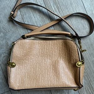 Stylish Dior crossbody bag in tan with black accents. Embossed logo design. Ideal for daily wear. Used once, like new condition :)