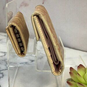 Elegant Dior accessory set in tan and pink. Includes wallet and card holder. Wallet measures: 4" H x 3 and 7/8" L x 3/4" D. Interior: Two currency pockets, one coin snap closure pocket, four credit cards slots, two slip pockets, flap snap closure. Key Holder measures: 4" L x 2" H x 1/2" D, with 4 key hooks, two slip pockets. Please see photographs of condition of wallet and key holder. Includes dust bag. (P11)