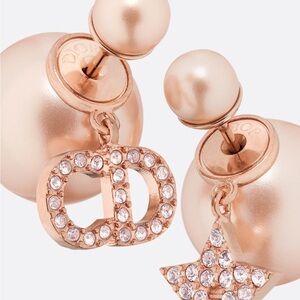 The Dior Tribales earrings are an iconic and modern style featuring two hallmark resin pearls. The asymmetric pair features a star on one rear pearl, and the CD initials on the other, both in a pavé of crystals with pink reflections. The front and the back may be mixed and matched with other Dior Tribales pieces, creating infinite possible looks.