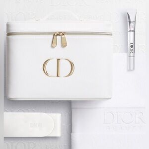 Chic white vanity case with elegant gold Dior emblem. Ideal for organizing beauty essentials.