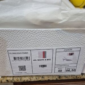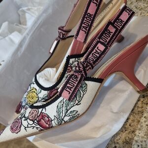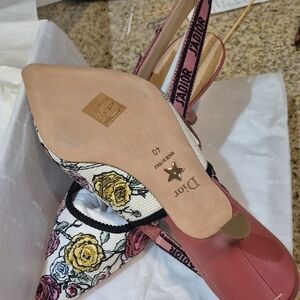 These Dior heels feature a sophisticated white body adorned with artistic motifs, complemented by pink kitten heels and matching straps. The elegant pointed toe and quality craftsmanship make them ideal for special occasions or professional settings. Brand new in the box