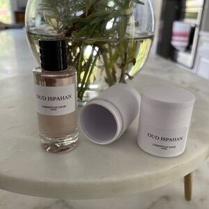 Dior black dust bag with deluxe perfume sample of Oud Ispahan. Will come in box shown. Great Christmas gift.