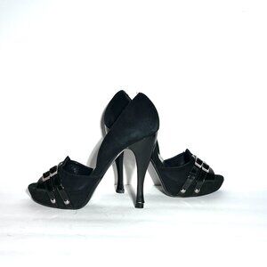 The pumps are a combination of black suede and black patent leather, with silver buckles stamped with Dior, as well as side silver studs fastening the straps to the side of the platfroms. Double straps over toes, on a 1 inch platform and 4.75 inch heel. Heels have a lovely. curved shape, and are covered in patent leather. Light wear on the soles. Heel taps will need to be replaced, as they tend to crack from age (not wear in this case). Light rubbing on suede from resting in the box, however, these were worn a few times, but no visible signs of wear and tear other than leather on sole of shoes.