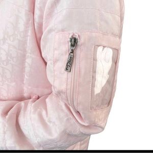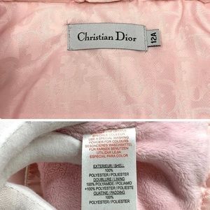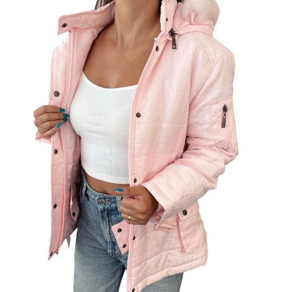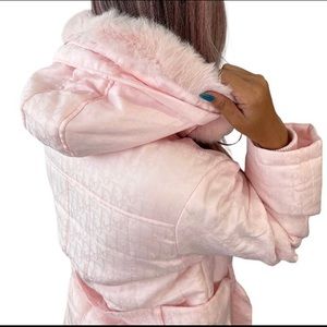 Dior baby pink monogram jacket. Beautiful condition. Bought at dior in Newyork in 2003. Features a detachable fur lined hood and a removable dior monogram belt. This is a child’s 12a which fits me very well. Shown what it looks like on a adult. I’m a size small. Height 5’3, 110 lbs
