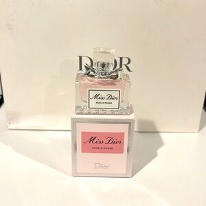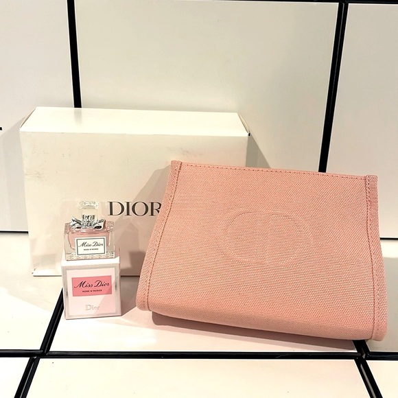 Dior set includes Dior pink pouch measurements approximately 7in (W) 4in ( H). Miss Dior rose n roses minature 5ml-0.17FL.0Z. NEW & UNUSED. PRICE FIRM.
