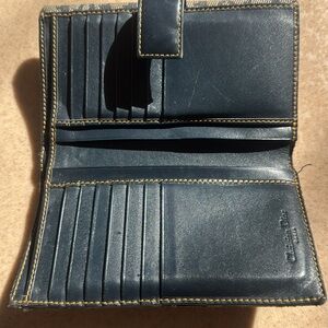 Gray and navy blue Dior wallet holds 14 credit cards has three compartments and has a little red dot one where it fastens have no idea where that came from, condition is great. A light wear around the corners but other than that in great condition.