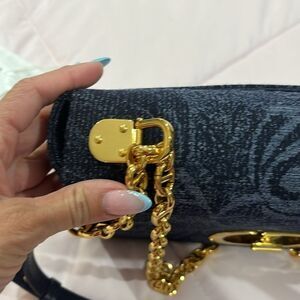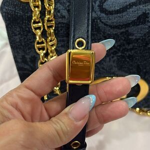 This Dior Caro Denim in in like new condition. Hardware is gold tone. Only used once. Most of the plastic is on hardware. Just the front lock area doesn’t have plastics on it. But the top sides do and the inside also. I am not sure if it’s considered the small or medium size but I put the measurements up on pictures so you can see how big it is. Fits a lot I think it’s the medium size very cute everyday kind of bag. 100% authentic. You can crossbody it or shoulder wear it.