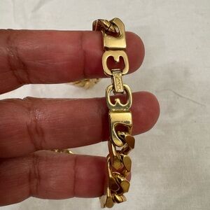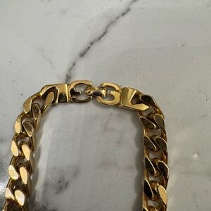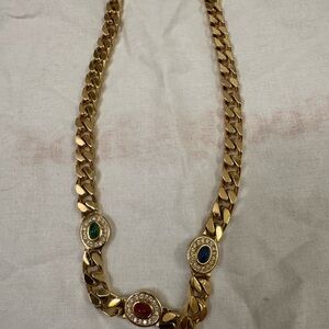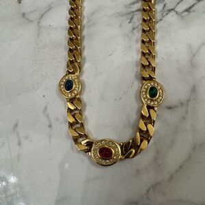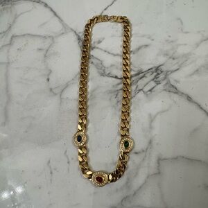 Christian Dior Vintage Cuban link chain gold tone necklace with red, green and blue crystals and diamonds