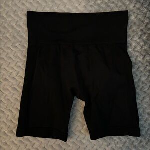 Stay active in style with this elegant black sports bra. Designed for comfort and support during workouts. Scrunched biker shorts.