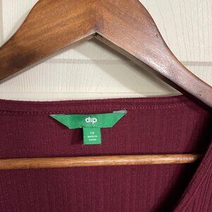 Dip Womens Burgundy Ribbed Long Sleeve Button Front Tie Blouse Size 1X. Measurements Shoulder to shoulder: 25" Underarm to underarm: 26" Length: 25" Sleeve: 20" Offers always welcome! Measurements are approximations taken while hanging