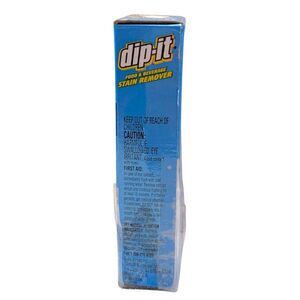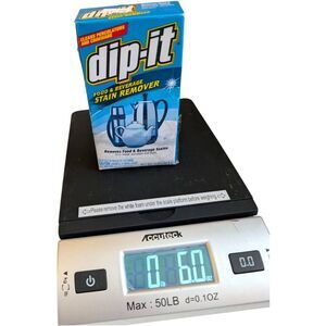 A brand new container of Dip-It Food & Beverage Stain Remover, 5 oz in fair condition. The outer packaging has water damage and is taped shut in one area to keep the container together, as seen in the photos. I was not the owner of this product when the packaging got damaged. I can only tell from what it looks like. A photo of the container's weight is included to show that the product has not been used, just had damage to the container. Comes from a smoke-free home.