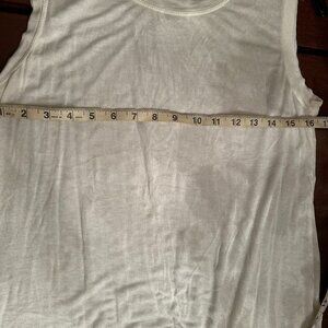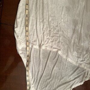 This is a lovely shirt that has been lightly worn. It has a dipped hem design (shorter in the front than in the back) and is sheer.