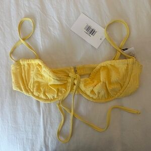 New With Tags/Unworn Bikini top and bottom from Dippin Daisy's in Size S. This bathing suit is super cute, fun, and flattering and comes in a beautiful butter yellow color. A bikini top with a bustier-style bra, featuring adjustable straps that tie into a bow at the center, the top also has a back clasp for customizable support. The super cheeky triangle bikini bottoms feature an adjustable scrunch waist and thick side straps and are a perfect pair match with the top.