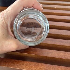 Clear glass holder with iconic black and white Diptyque label. Sophisticated design.