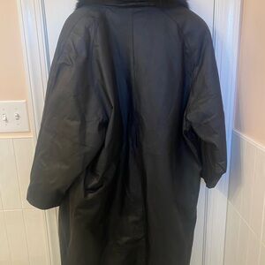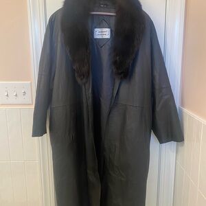 Direct Action Black Genuine Leather Trench with Fur Collar Size M. Missing the belt, but besides that this is in pristine condition. The dyed blue fox color is so luxurious and soft you’ll never want to take this jacket off. 19.5” shoulder to shoulder, 48.5” long from shoulder to bottom. I’m 5’9 and this hits at my calves.