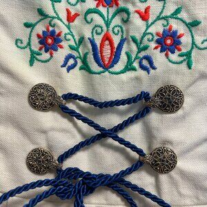 Vintage Teen's Dirndl. XXS in european sizing. Best used for costume party as the blue piping has bleed into the white fabric. Need a good ironing. Only worn a few times. From a smoke free home. Beautiful buttons! Armpit to Armpit 16 in, waist side to side 14 in.