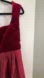 Red velvet top with shiny, satin-like, pleated skirt. Zipper front. Top is lined. Apron is dark red with a light grey pattern.