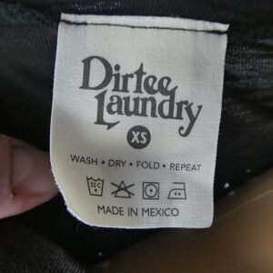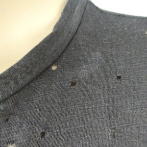 Machine washable cotton/spandex. Dark brown tee covered in intentional holes with large faux band graphic on front. Size xs.