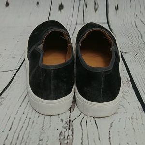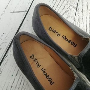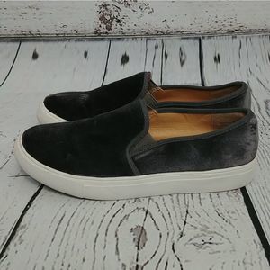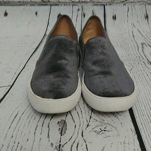 Gently used Dirty Laundry gray velvet slip on sneakers. Size 6 1/2. Some discoloration on the white parts and bottoms. A couple spots of wear on the Velvet as pictured.