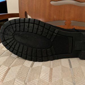 These canvas booties have a round toe and raw edge trim all the way around. They are from Dirty Laundry --a division of Chinese Laundry. Their website says: "Dirty Laundry is casual and vintage-inspired, with a twist of California rocker-cool," which perfectly describes these booties! Made of canvas with a rubbery tread sole, a great feature is how light they are. After wearing your heavy Doc Martens all day, these are a nice change!