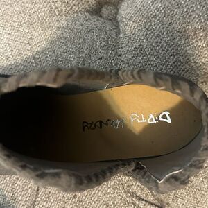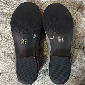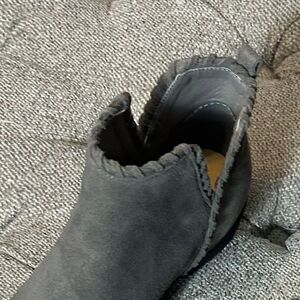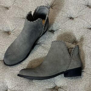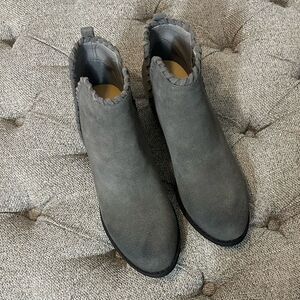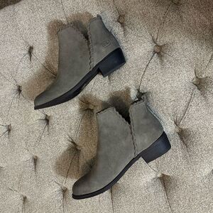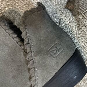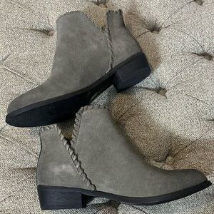 Dirty Laundry Faux Suede Booties. Features detailed trim along top. Round toe and pull on style. Approximately 2.25” stacked heel. Color is an army green/khaki. New without box.