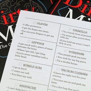 DIRTY MINDS: The World’s cleanest dirty game. Set includes 912 naughty clues, 304 squeaky clean answers, 4 puzzle booklets, 35 letter cards and 15 game cards.