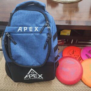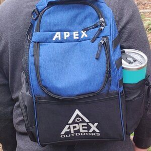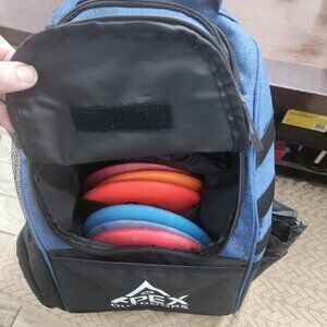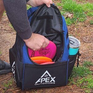 The main compartment of this disc golf bag can hold 16 discs, and the upper compartment can hold 5 discs