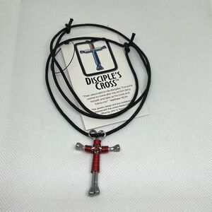 The Disciples Cross is made up of three distinct components. The simulated leather cord reminds us of the leather straps used to be our savior; The wrapped wire stands for the thorn branches twisted into a crown to mock the King of Kings; and the nails represent the large spikes that were driven into the hands and feet of the Lord of Lords.