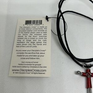 The Disciples Cross is made up of three distinct components. The simulated leather cord reminds us of the leather straps used to be our savior; The wrapped wire stands for the thorn branches twisted into a crown to mock the King of Kings; and the nails represent the large spikes that were driven into the hands and feet of the Lord of Lords.
