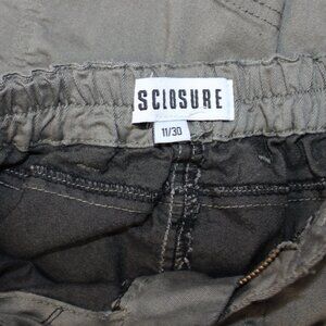 Nicely designed Disclosure baggy leg cargo khaki pants in a size 11/30. These pants have two deep hand pockets on the front along with three cargo pockets. Pants have a button/zip closure but also have elastic on the back and sides for the prefect fit.