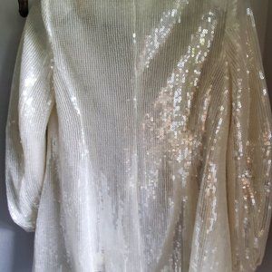 White disco Blazer! Shiny and all of your disco vibes can be found here! It is true to size and has a button you can use in the middle. There is a slit in the back for more airway and flair!