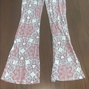These are very comfortable thing and soft material. They disco style pants with blue, pink, and white patterns. They flair out at the end.