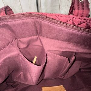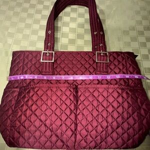 This sophisticated burgundy tote showcases a quilted texture and a structured design, perfect for carrying essentials with style. Its spacious interior and double handles offer versatility and elegance, making it a timeless accessory for any occasion. Has 2 open pockets and 1 zippered pocket inside. Also has 1 big zippered pocket on the backside. Excellent used condition!