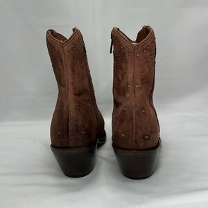 These discontinued Lucchese brown suede ankle zip up cowboy boots with studs are in great condition. They have been worn, but still come in the original box. The listing says the brand is Ariat, depop didn't have "Lucchese" as a brand option so I picked something close.