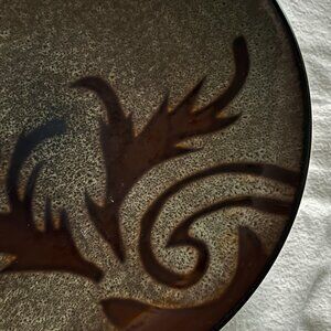 This pattern was manufactured between 2005 and 2007. The reactive glaze ceramic is hand embellished. The differneces in color and texture are normal for this process. There is a slight curve/lip around the edges of this plate. It can be used as aserving plate. It is microwave and dishwasher safe.