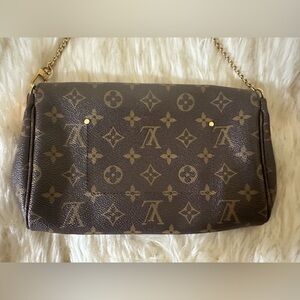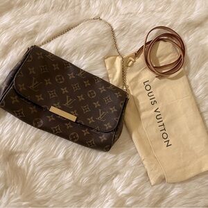 Louis Vuitton’s discontinued Favorite MM bag. Can be worn on the shoulder with a beautiful gold chain or worn as a crossbody. LV BOX included, LV SHOPPING bag and LV PROTECTIVE pouch. Elevate your style with this Louis Vuitton brown monogram shoulder bag. Perfect for any occasion, this bag combines luxury and functionality.