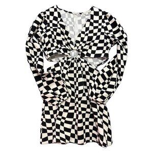 Discovery Black & White Checkerboard Dress with Bell Sleeves and Keyhole Front