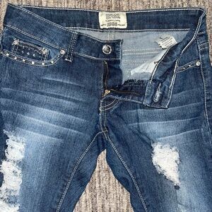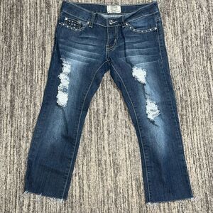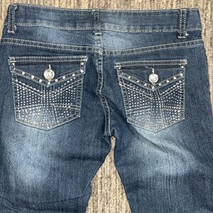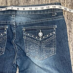 Discovery Clothing Womens Medium 30” Blue Rhinestone Flap Pockets Cut Off Capris