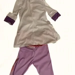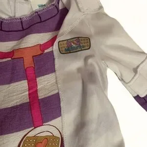Adorable Doc McStuffins kids costume featuring a playful purple and pink design. Includes top, pants, and headband. Perfect for dress-up and imaginative play. One small tear at right shoulder, as seen in picture.