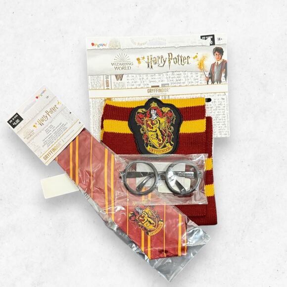 This Disguise Harry Potter 3-piece accessory set includes a Gryffindor house necktie, a striped scarf, and signature round plastic glasses. These items are New With Tags and offer an officially licensed way to complete a wizarding world ensemble for Halloween, school events, or themed parties.