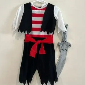 Pirate costume by Disguise. Features red and white striped shirt. Black vest and pants. Includes red belt, all one piece