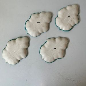 Lot of 4 blue green crackle glass small trinket dishes. Approx 4.5" x 4" leaf shaped with a leaf vein design. Each is signed with an embossed makers mark on the base. Please see all pictures for detail.