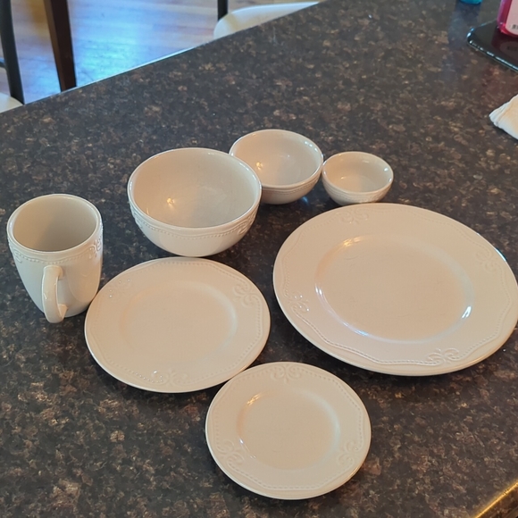 This eight-setting dishware set is porcelain and is from the JC Penney Home collection.