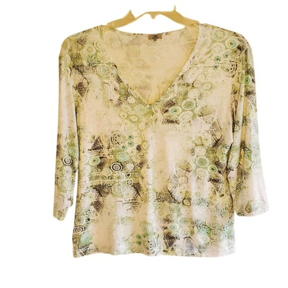 Elevate your everyday look with this Dismero top, made in Italy and crafted from a soft stretch rayon blend. Featuring a unique abstract floral print in soothing green and neutral tones, this lightweight blouse offers effortless elegance with its flattering V-neckline and relaxed fit. The perfect blend of Italian craftsmanship and modern casual style, it's ideal for both workwear and weekend outfits. Size XL. 90% rayon, 10% elastane.