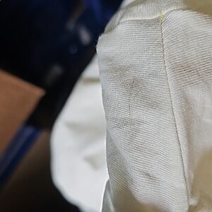 This adorable little top is soft and cozy. a cream color with the design of gray circles with an outline of silver. made in Italy. Size large, pit to pit flat measurement is 20". Sleeves are 13". The top to bottom length is 25. excellent condition except a small light line shown in the last photo. I did not try to clean.