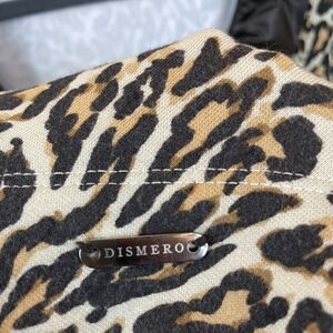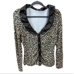 Dismero Cheetah Top, size L - VGUC. Made in Italy. Buttons in front. Knit fabric with Rouched collar. Fabric shows light wash wear. Please see photos for approximate measurements