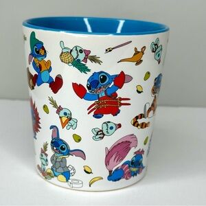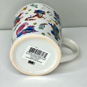 The mug is inspired by the Disney movie Lilo & Stitch and specifically features the character Stitch in various costumes. It features an allover design of Stitch and Scrump among various doodles.