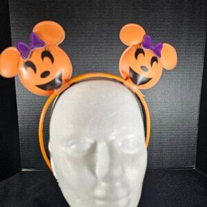 The orange and black color gives it a classic Halloween look, and the Disney franchise adds a touch of magic to the piece. Whether you're going to a party or just want to show off your Halloween spirit, this headband is a must have accessory. Faux leather material in orange, has Jack O Lantern, Minnie Mouse features with a purple bow between her ears. Pre owned nice condition. Non smoking pet free home.