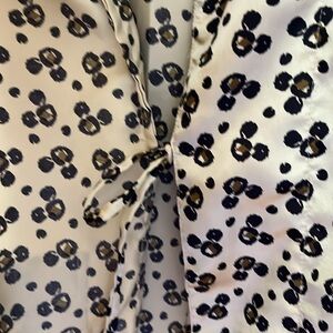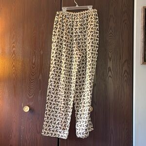 Disney 2 pc. Lounging set with pants and robe. Silky appearance of shiny gold with mouse heads in black/ brown. Robe is missing a belt. Size Small/ Medium. Long pants measure 41 inches.